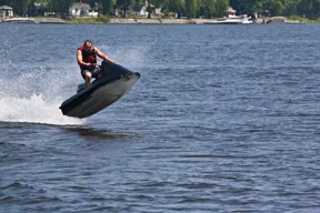 Last night’s stop was at the upscale Chateau Montebello, purported to be the world’s largest log cabin, with an adequate marina and services. The fare was a little high for the scale of the marina at $3.33 per foot plus taxes (about 15 percent) but it gave us the run of the property’s heated pools, saunas, and spas of which we took full advantage—and a nice supper in the restaurant. On the way up waveriders took advantage of our surf. We caught one of several pounding through our four-foot wake raised on purpose for their enjoyment and a little hamming for the camera.